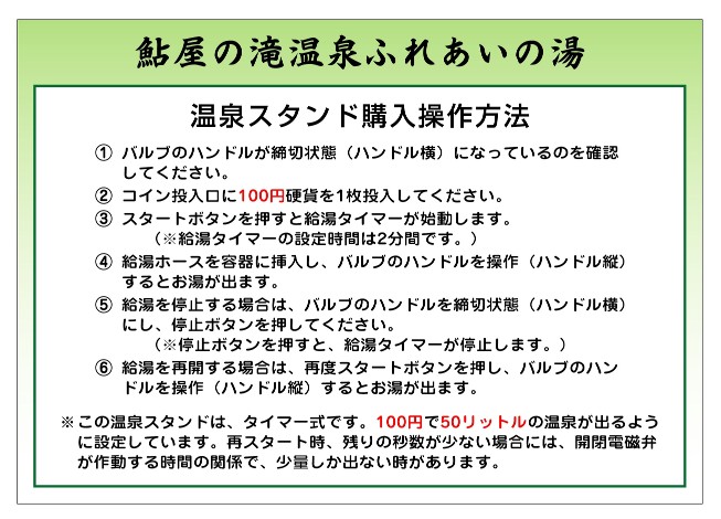 温泉スタンドはタイマー式です。100円で50リットルの温泉が出るように設定しています。再スタート時、残りの秒数が少ない場合には、開閉電磁弁が作動する時間の関係で、少量しか出ない時があります。